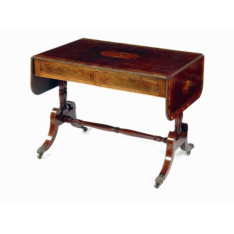 An early 19th century mahogany sofa table, the top inlaid marquetry shells, stringing and laburnum banding, above a pair of frieze drawers, on a twin turned supports united by turned stretcher on scroll legs, to brass sabots and castors, 28in (71cm) h, 37in (94cm) w, 85.25in (64cm) d.