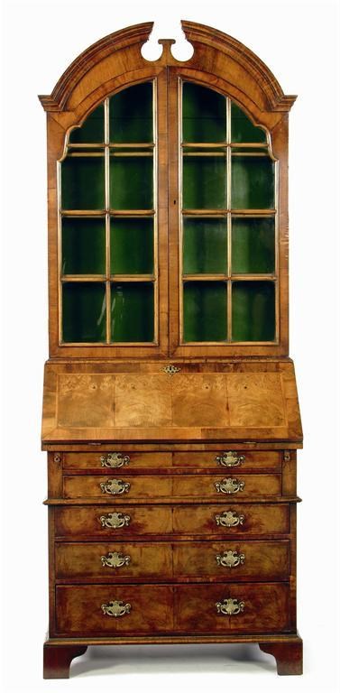 A walnut bureau bookcase, in Queen Anne style, the astragal glazed doors enclosing painted interior with adjustable shelves, above a feather banded fall with central cupboard door, pigeon holes and shaped drawers above lopers and two long drawers to a girdle moulding and three further drawers, fitted brass plate handles on bracket feet, 20th century, 84.25in (214.6cm) h, 34in (86.4cm) w, 18.25in (46.4cm) d.