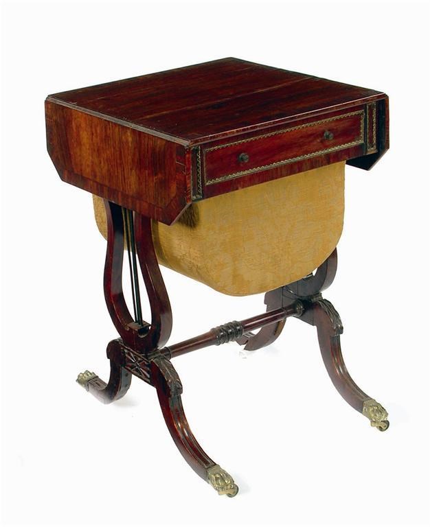 A George IV rosewood sewing table, the crossbanded top with canted corners above a frieze drawer and a bag on lyre end supports to leaf carved scroll legs to brass paw sabots and castors, old restoration, 27in (68.5cm) h, 18.5in (47cm) w, closed, 18.25in (46cm) d.