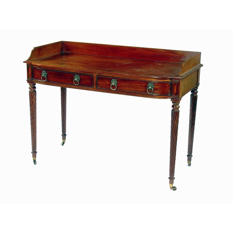 A 19th century mahogany barrel front washstand, the three quarter to above a pair of frieze drawers fitted lion mask ring handles on turned spiral ribbed legs brass castors, 33.5in (85cm) high, 45in (114.5cm) w, 22in (56cm) d.