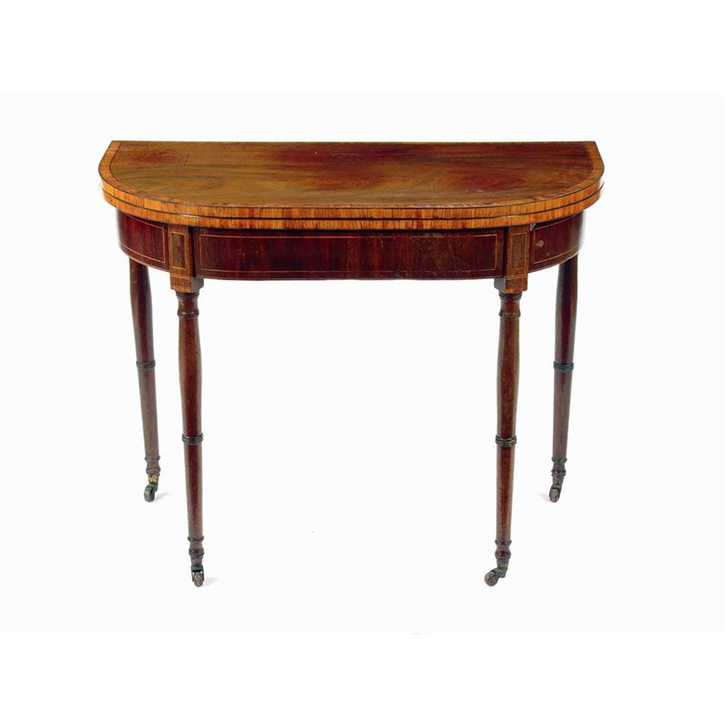 An early 19th century mahogany D-shape card table, the satinwood banded hinge top to a later baize on twin gates with turned legs to later castors, 28.75in (73cm) h, 36in (91.5cm) w, 17.75in (45cm) d.