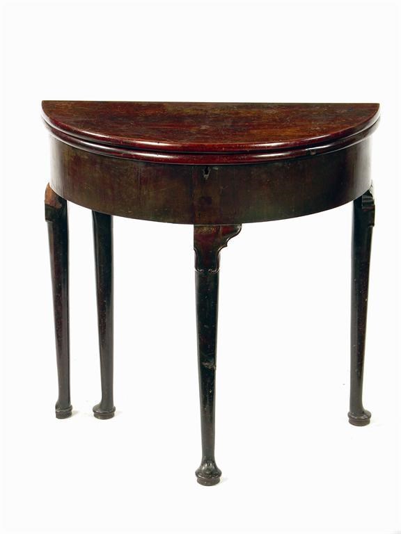 A George II mahogany demi lune tea table, with a double hinged top to a well and a plain frieze on turned club legs with moulded outline brackets and pad feet, 29.5in (75cm) h, 29.25in (74cm) w, 14.25in (36cm) d.