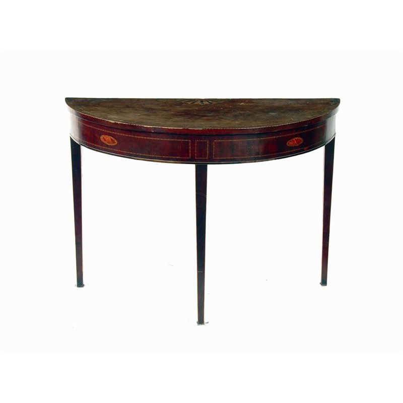 A late George III mahogany demi lune pier table, inlaid marquetry and chequer stringing, 29in (73.5cm) h, 40.5in (103cm) w, 19in (48cm) d.