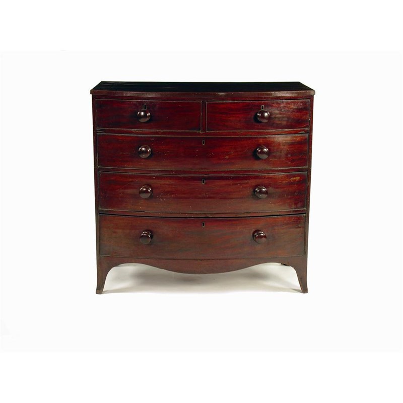 An early 19th century mahogany bowfront chest, the reeded edge top above two short and three long graduated drawers, fitted turned wood handles, on splay bracket feet, 40.75in (103.5cm) h, 42.25in (107.3cm) w, 22in (56cm) d.
