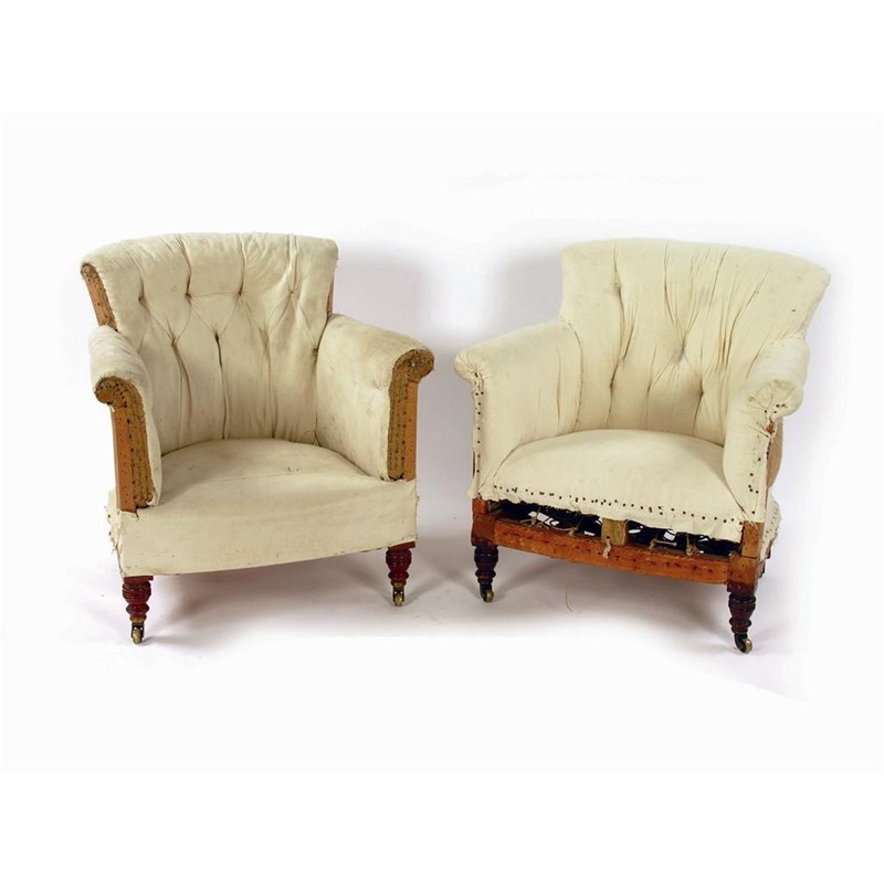 Howard and Sons. Two similar easy armchairs, un-upholstered, one on turned walnut legs, stamped '13038, 4286, Howard and Sons Ltd, Berners St.,' with paper label and stenciling to underside, the other on turned oak legs stamped '7445, 6637, Howard and Sons Ltd, Berners St .,' both with brass castors, all stamped. (2)
