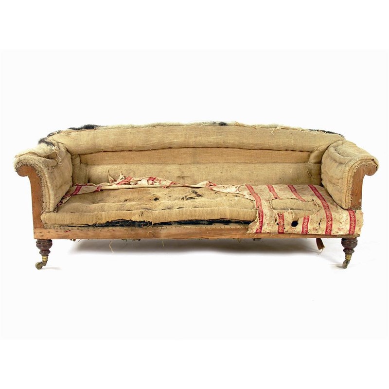 Howard & Sons. A scroll end settee, un-upholstered, on turned oak legs, the back left stamped '1758, 1033,' the brass castors stamped 'Howard & Sons Ltd London,' 31in (78.5cm) h, 83in (211cm) w, 32.5in (82.5cm) d.