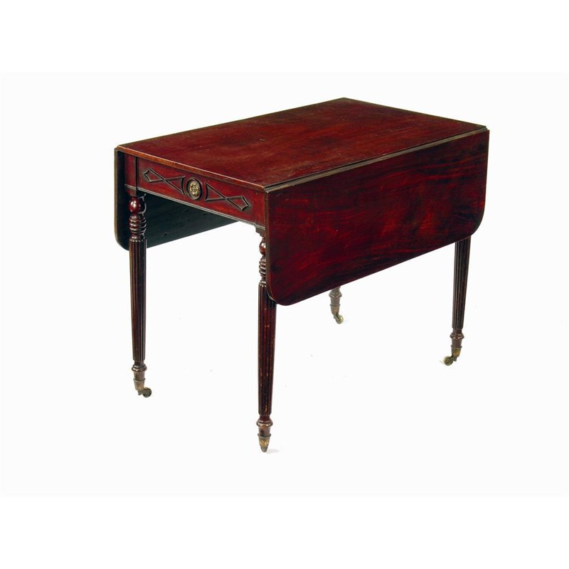 A Regency mahogany Pembroke table, with a frieze drawer having applied outline mouldings and centred a gilt brass rosette, with conforming reverse on ring turned ribbed legs, with brass castors, 29.5in (75cm) h, 23.75in (58cm) w, closed, 36.5in (92.5cm) d.