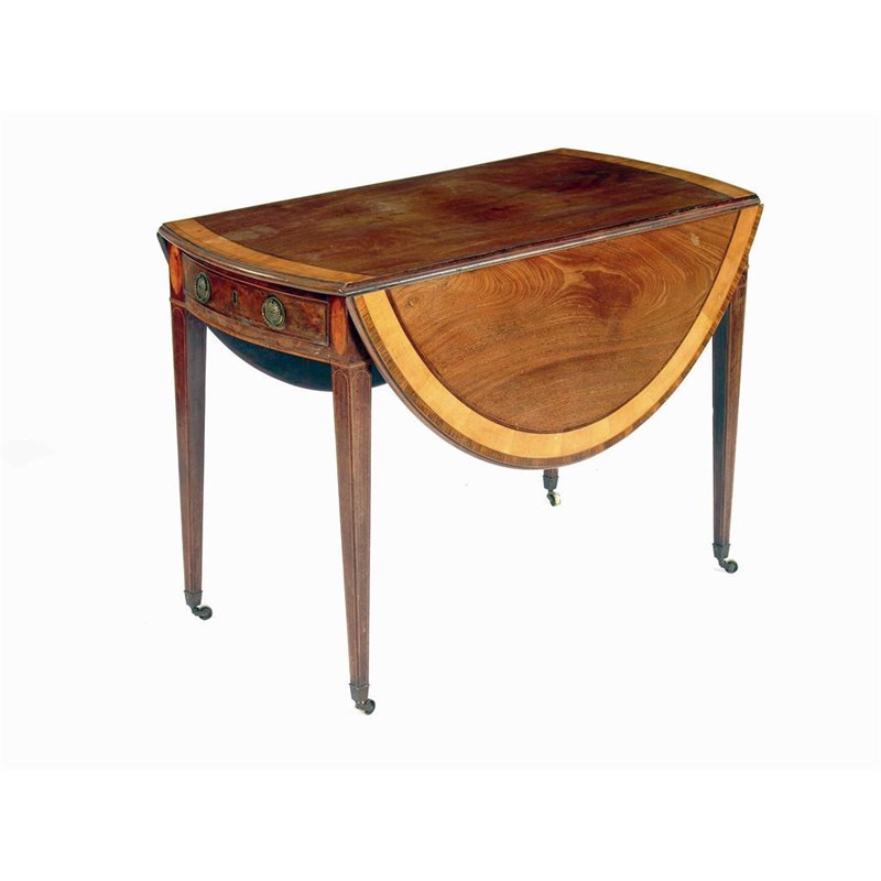A 19th century mahogany Pembroke table, the oval top crossbanded in satinwood, rosewood and inlaid stringing to a moulded edge the frieze drawer and false reverse fitted later differing brass plate handles on satinwood panelled headed square tapering legs to brass castors, 28.5in (72.5cm) h, 48.5in (123cm) open, 40in (101.5cm) d.