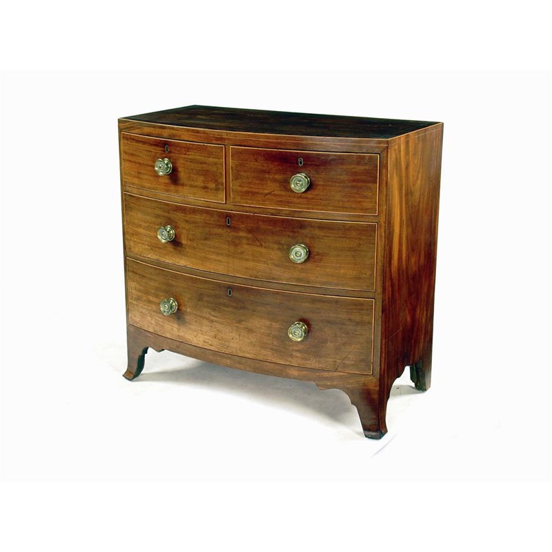 A Regency mahogany bowfront chest of low proportions, with boxwood edging, the banded front top above two short and two long cedar lined drawers, fitted brass knob handles on splay bracket feet, 36.25in (92cm) h, 38in (96.5cm) w, 21in (53cm) d.