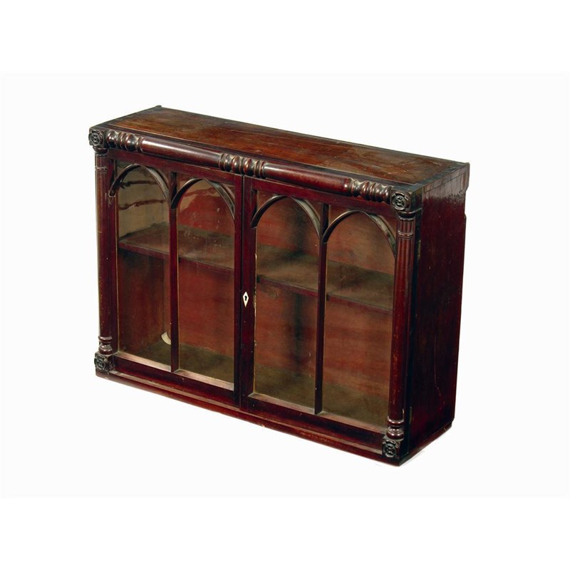 A William IV mahogany cabinet, with a pair of arched glazed doors enclosing an adjustable shelf framed by turned split pilasters and cornered by carved florets, 20.75in (53cm) h, 28in (71cm) w, 9in (23cm) d.