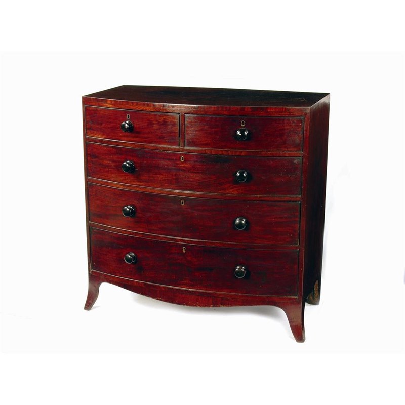 A Regency mahogany bowfront chest, the part crossbanded frieze above two short and three long graduated drawers fitted wood knob handles on splay bracket feet, 42in (106.5cm) h, 44in (111.5cm) w, 21.75in (55cm) d.