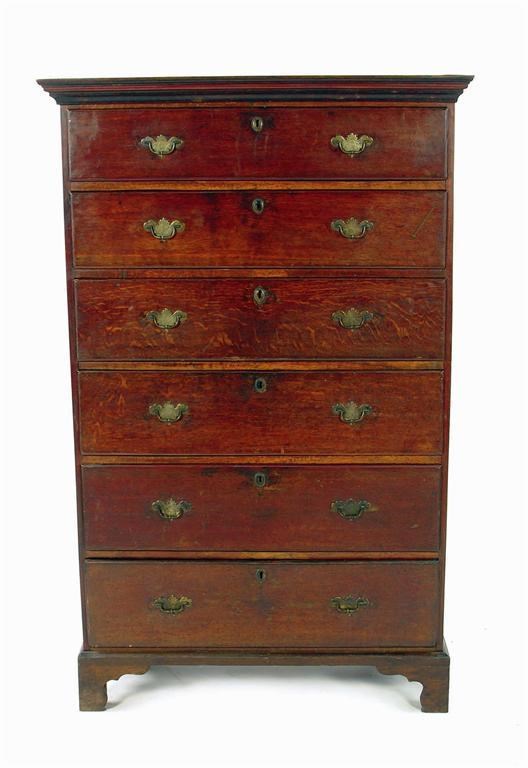 A late George III oak tall chest, the moulded cornice above six long drawers, fitted later engraved brass plate handles, on bracket feet, 62in (157.5cm) h, 39.5cm (100cm) w, 17.75in (45cm) d. Right hand side with large patch.