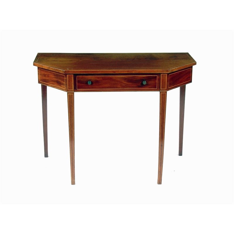 A mahogany side table, inlaid boxwood stringing with canted corners and a single frieze drawer on square tapering legs, 19th century and later, 29in (74cm) h, 40.25in (102cm) w, 20.75in (52.5cm) d.