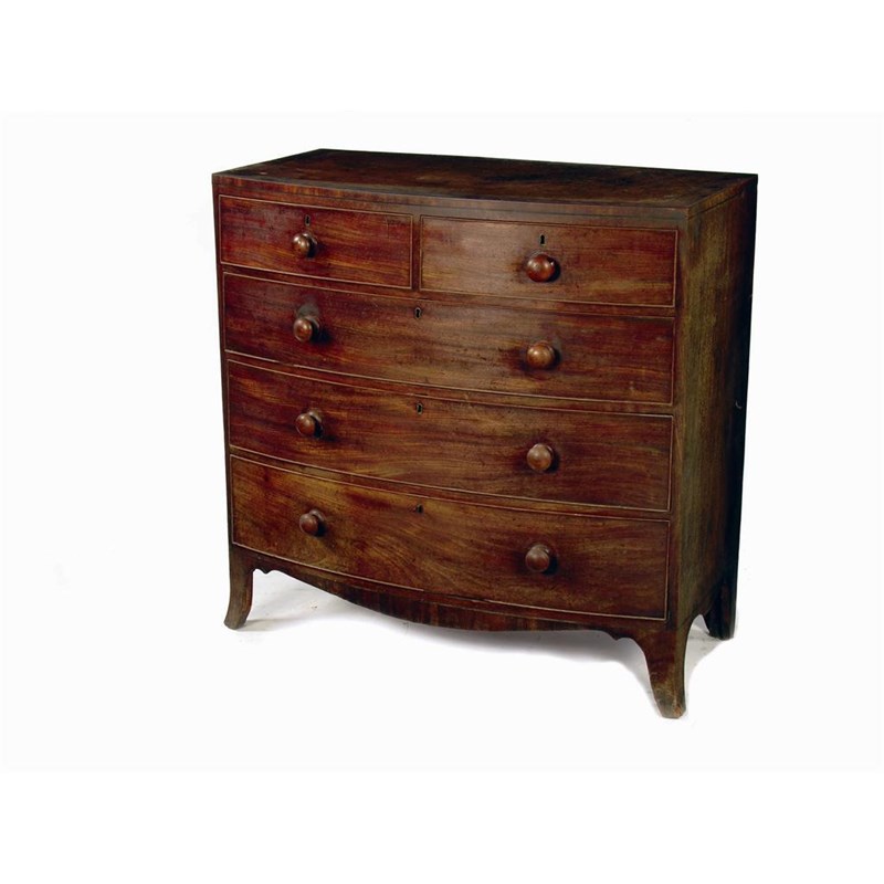 An early 19th century mahogany bowfront chest, the cross banded top with inlaid stringing above two short and three long graduated drawers fitted replaced wood knob handles to a shaped apron on splay bracket feet, 41in (104cm) h, 41.75in (106cm) w, 21.5in (54.5cm) d.