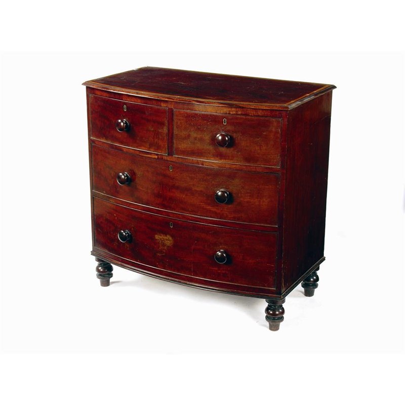An early 19th century mahogany bowfront chest, the later satinwood banded top above two short and two long drawers fitted wood knob handles on turned feet, 36in (91cm) high, 36.5in (92.5cm) w, 21in (53.5cm) d.