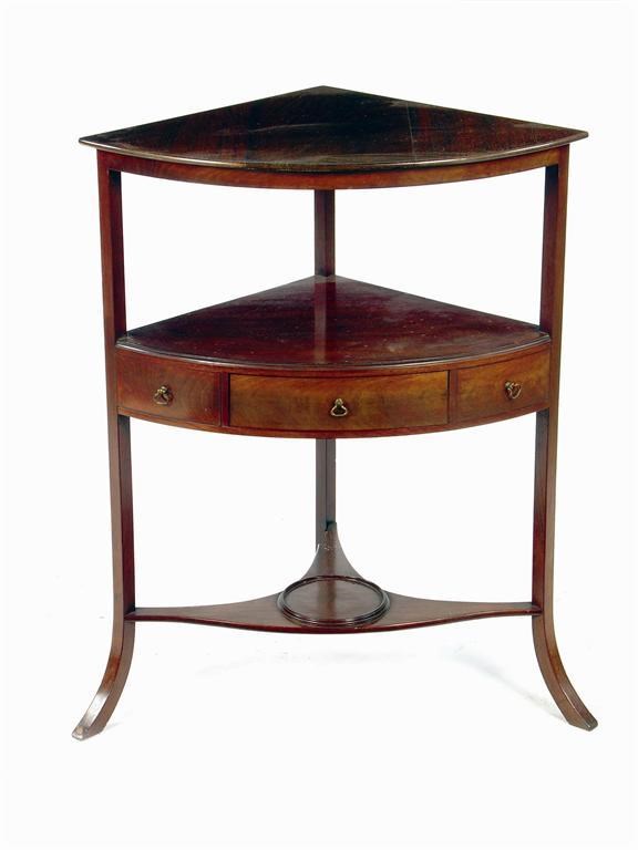 An early 19th century mahogany corner washstand, having a later top, a single frieze drawer flanked by false drawers the splayed feet united by a shaped stretcher shelf, 33in (84cm) h, 28.75in (73cm) w, 17in (43cm) d.