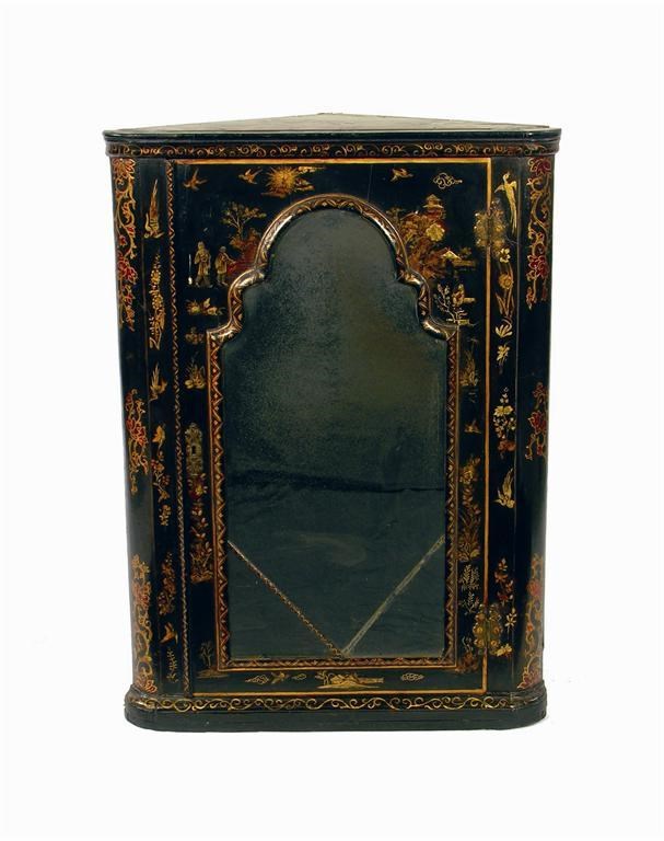 A Japanned hanging corner cupboard, the black ground with gilt decoration of figures, birds, foliage and buildings, centred a bevelled arched mirror plate, one corner later, within moulded frame, to three shelves, 18th century and later, 37.25in (94.5cm) h, 27.25in (69cm) w, 15in (38cm) d.