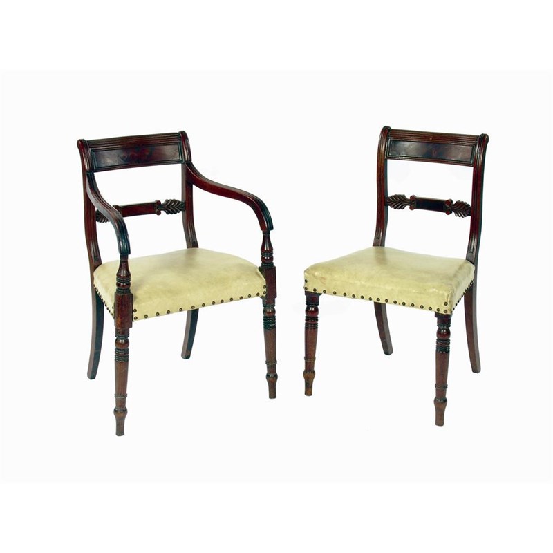 A set of eight early 19th century mahogany dining chairs, with tablet top rails and carved horizontal splats, the later covered seats on turned tapering legs comprising a single open armchair and seven sides. (8)