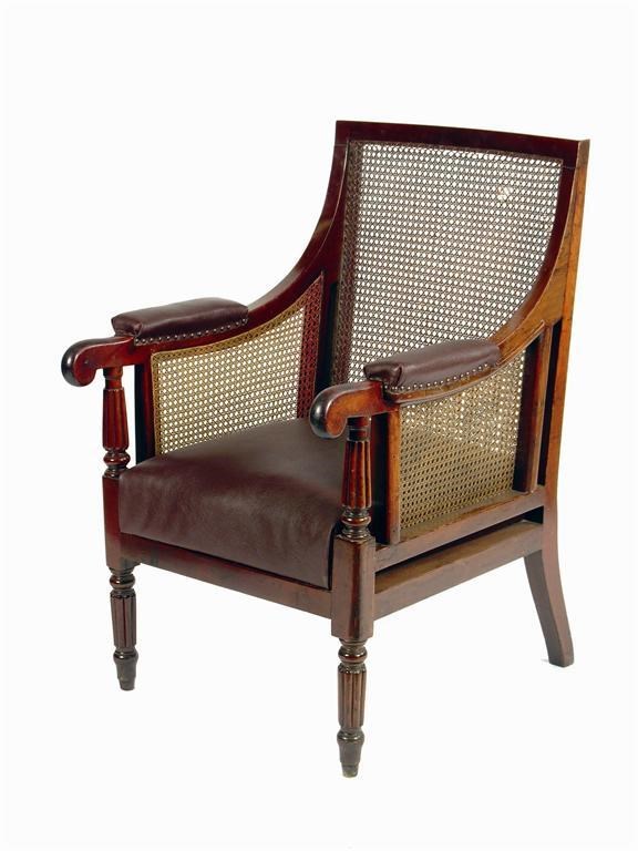 A 19th century mahogany bergere, the drop-in seat and arm rests later covered leatherette, castors missing.