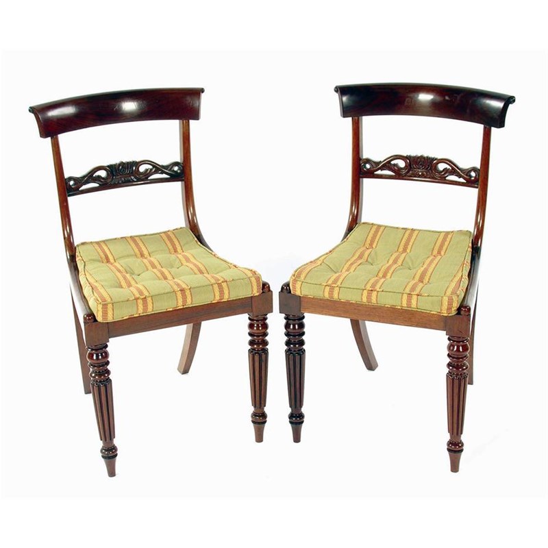 A set of eight George IV rosewood side chairs, with pierced and carved horizontal splats to cane seats with later button squab cushions on turned and ribbed tapering legs. (8)