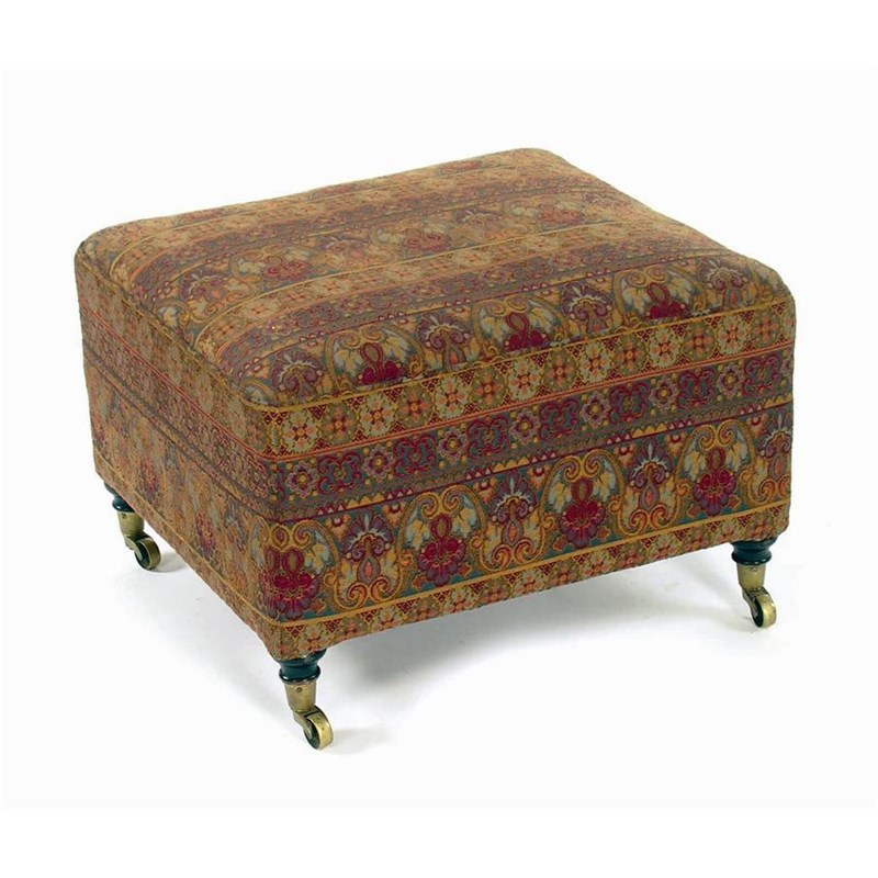 A rectangular stool, on turned ebonised legs to brass castors stamped J.W. Lewty's Patent (crowned), 15in (38cm) h, 22.5 x 19.5in (57 x 49.5cm).