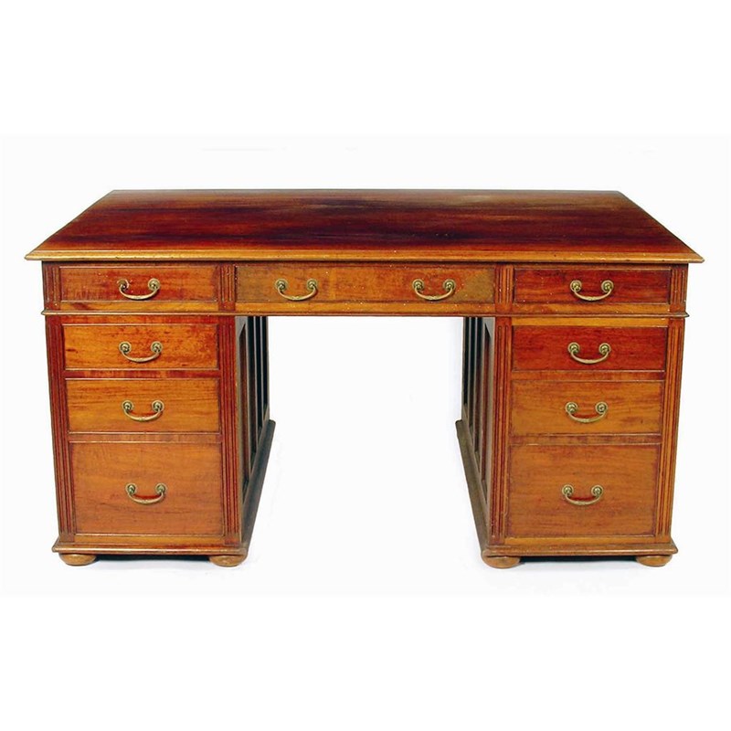A walnut partner's pedestal desk, the moulded edge top above three frieze drawers to either side, one with an ivorene label 'A.PENGGELLEY & CO. EDWARDS TOWN, S.A.', the pedestals with three drawers, the reverse with rectangular panel doors enclosing slides, 30.25in (76.5cm) h, 60in (152.5cm) w, 42.5in (108cm) d.