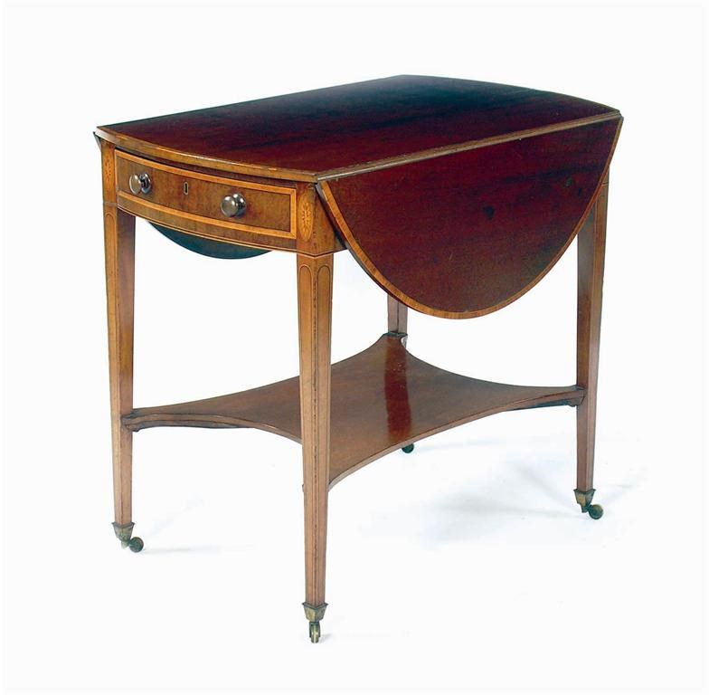 A late Victorian mahogany Pembroke table, inlaid stringing, the kingwood banded top above a frieze drawer fitted later wood handles on square tapering legs headed by elliptical marquetry flowerheads, to a shaped stretchered undertier, on brass casters, 28.75in (73cm) h, 20.5in (52cm) w closed, 31.75in (80.5cm) d.