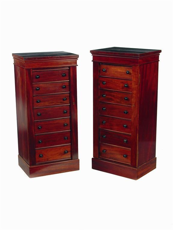 A matched pair of mahogany Wellington chests, both with seven drawers fitted ebonised knob handles and a side locking pilaster, 43in (109cm) h, 19in (48.5cm) w, 15in (38.5cm) d. The other slightly smaller. (2)