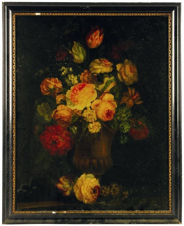 A pair of colour prints on glass, Still Life, vases of flowers, 20 x 15.5in (51 x 39.5cm). (2)