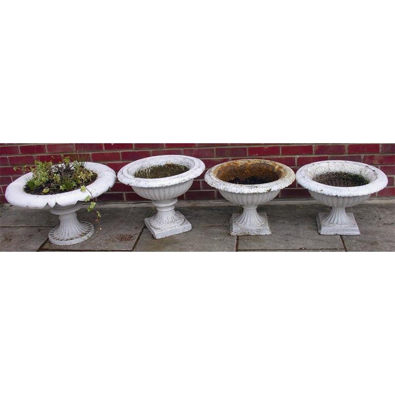 Three white painted cast iron garden urns, the circular shallow ribbed bowls with ribbed sides, the highest 16.5in (42cm) h, 21.5in (54.5cm) dia, together with a similar urn with plain sides and a shaped fold over rim. (4)