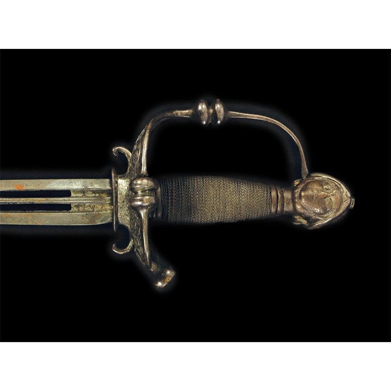 An early 17th century riding sword, the blade with two pierced fullers, signed 'Van Martinez,' to a steel hilt with pierced sideguard and pommel in the form of a human head, 38.5in (98cm) l.