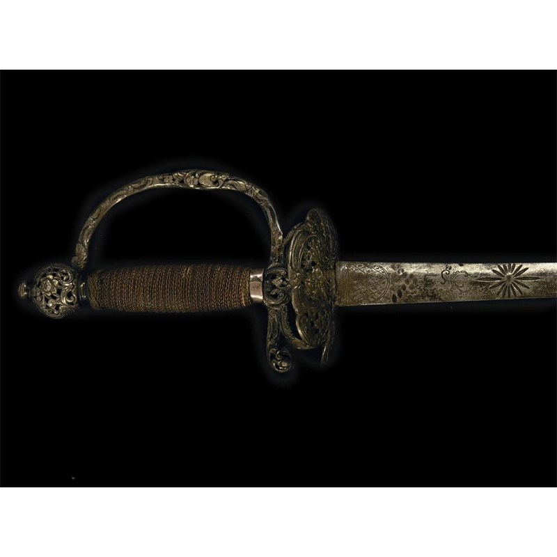 A mid 18th century silver hilted smallsword, the blade engraved stands of arms, figures and foliage, the pierced hilt decorated foliage, traces of gilt, 39.25in (99.5cm) l.