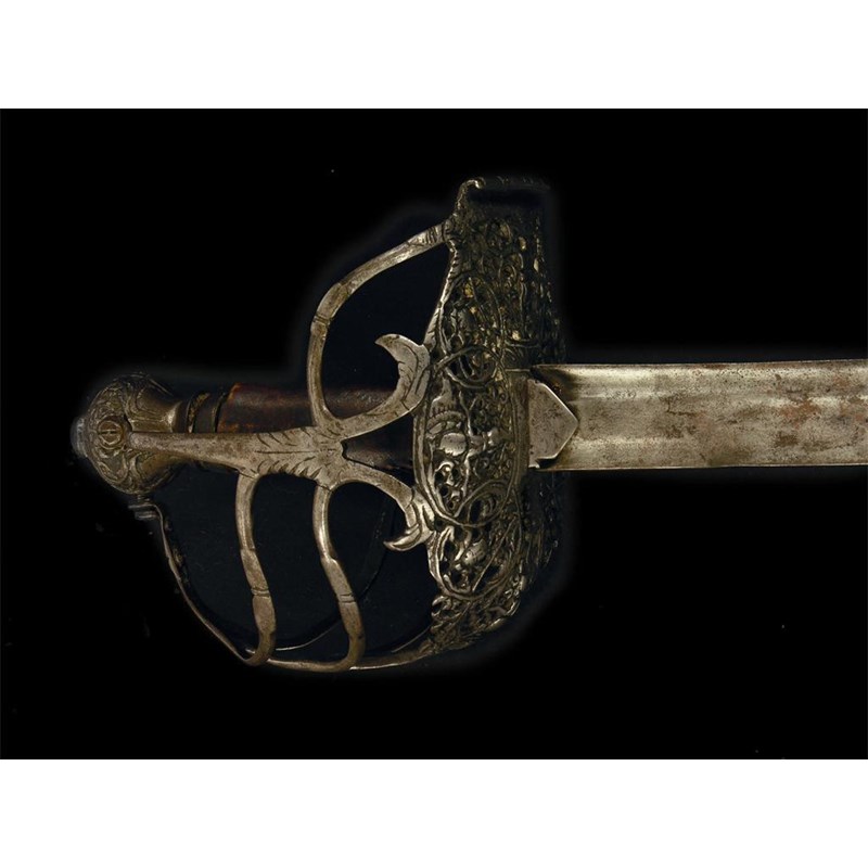 A mid 17th century mortuary sword, with a double fullered back edge blade, the steel hilt with scroll sidebars and a chiselled and pierced base of figures and foliage, 36.5in (92.5cm) l.