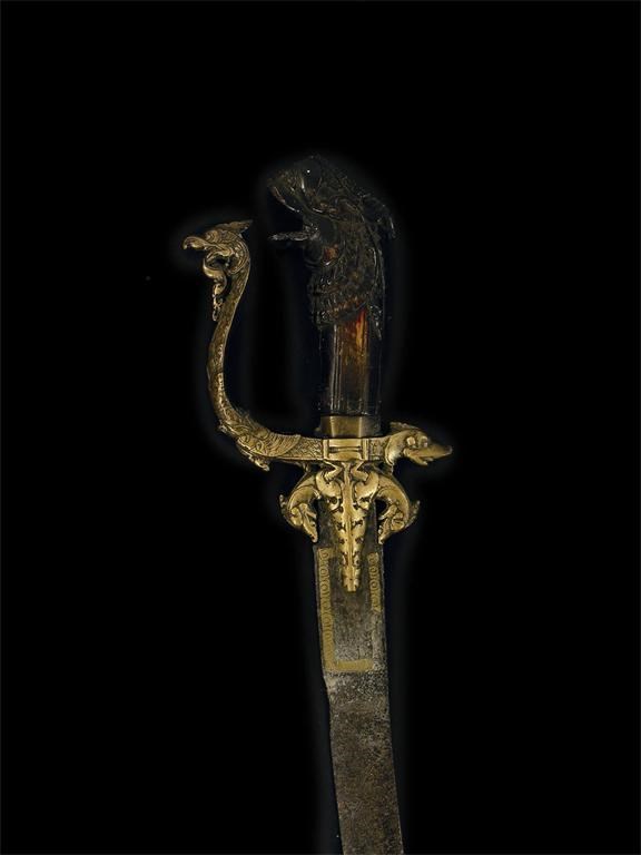 A Ceylanese kastane, the blade with brass inlay to a carved wood handle with brass mounts of animal's heads, pommel missing, 23.25in (59cm) l.