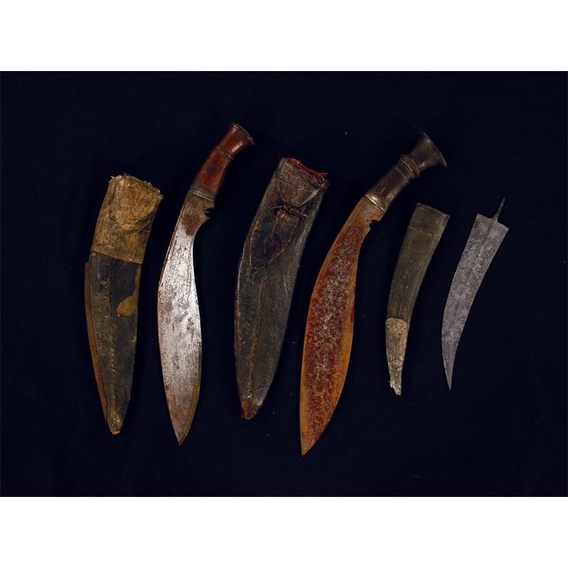 A kukri, with wooden hilt and leather scabbard, another and an eastern blade. (3)