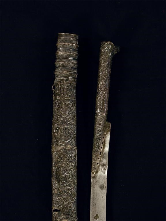 A Turkish yatagan, the recurved blade stamped a mark with a silver hilt and scabbard, embossed a ship attacking a fort, stands of arms, scolls and foliage, 24.5in (62cm) l.