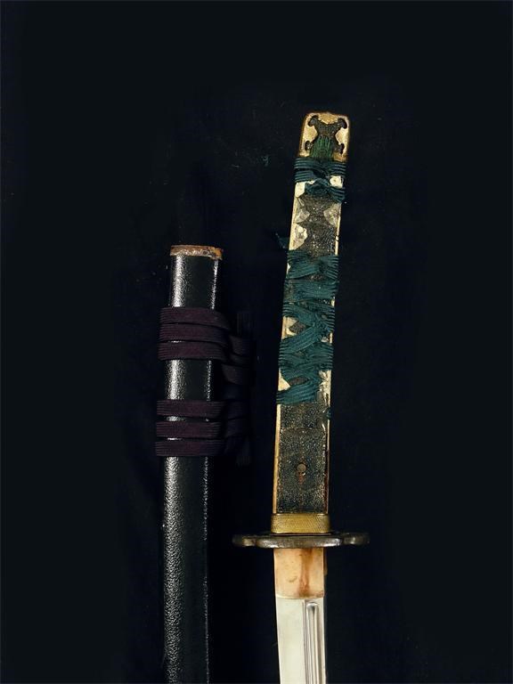 A Japanese handachi, 75.1cm blade with hi, choji midare hamon, the tang with one hole, signed and dated, the iron tsuba decorated with Shoki and an oni, the hilt and scabbard with gilt handachi mounts and a later wooden stand.