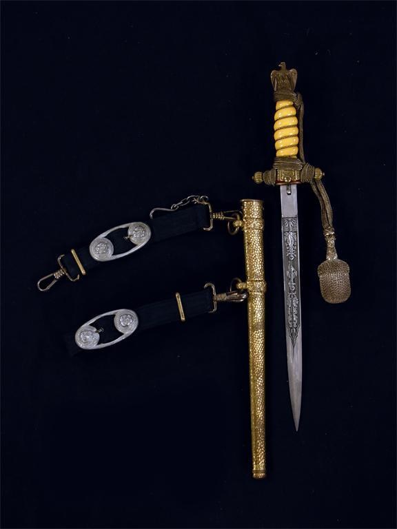A German Naval dagger, the etched steel blade stamped 'WK(C)', with a brass and composite handle and punch beaded scabbard.