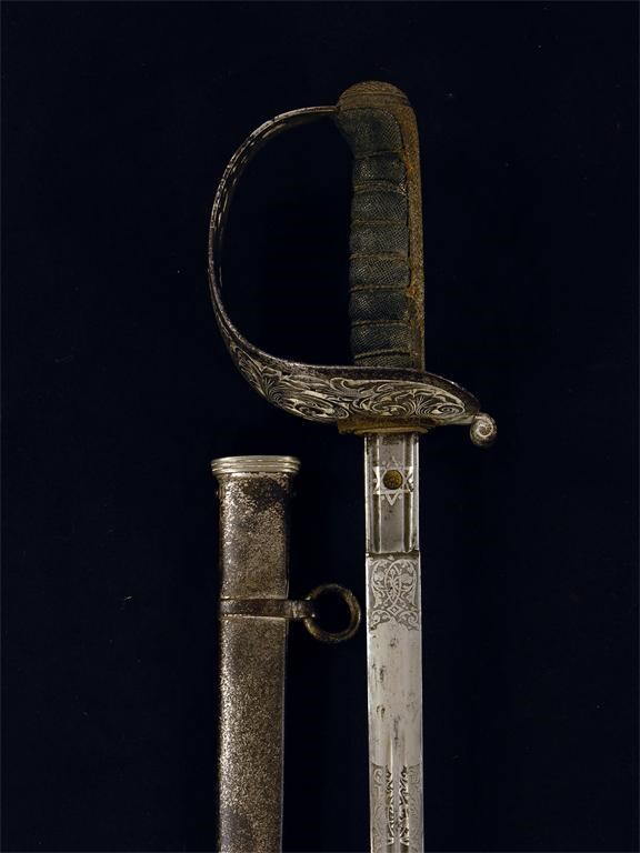 A highland Officer's dress sword, the blade etched thistles, crests and cyphers, by John Jones & Co, Regent St London SW,' with pierced guard and shark skin grip, 40in (101.5cm) h, with scabbard and slip.
