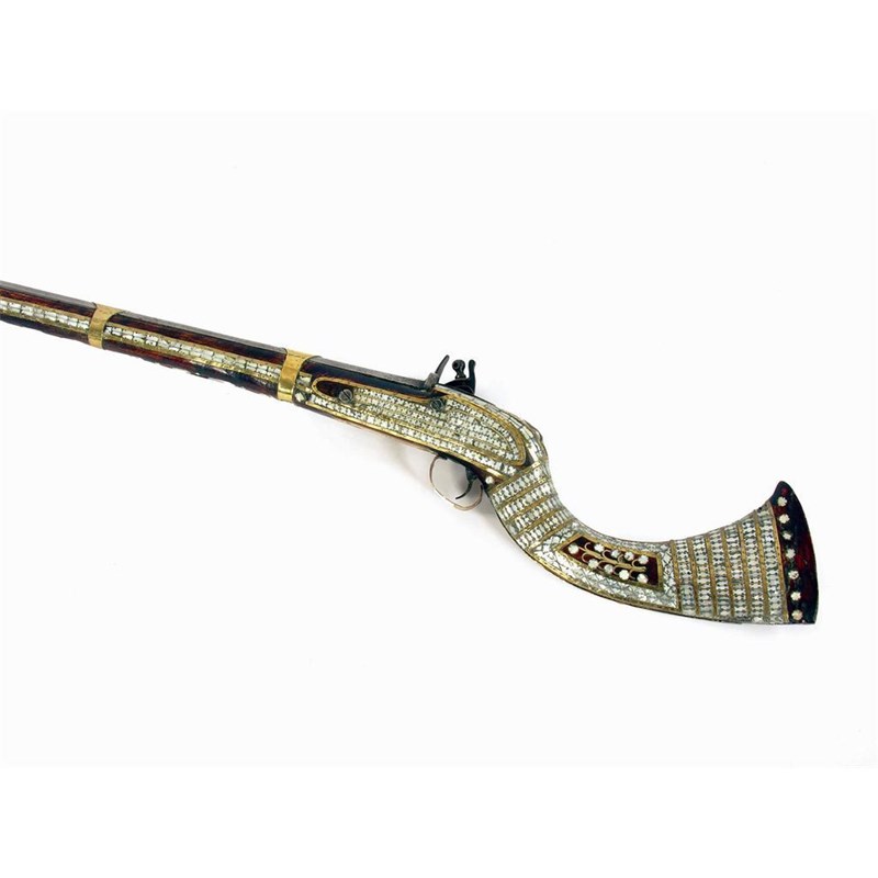 An eastern flintlock Jezel rifle, the faceted barrel to a mother of pearl and brass inlaid stock, 60in (152cm) l.