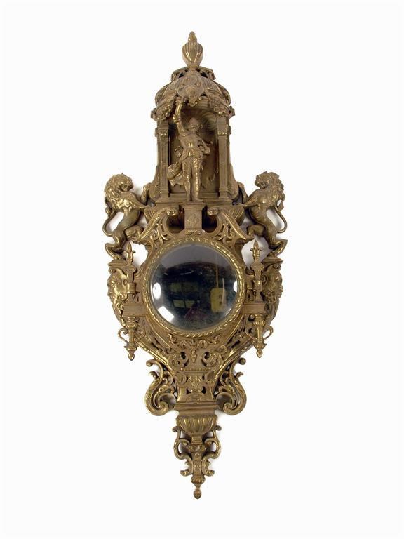 A late 19th century continental gilt brass clock case, decorated a knight in armour flanked by a pair of lions on mask supports, the domed glass hinged door revealing a gong, 6in (15cm) dia, 33in (84cm) high.