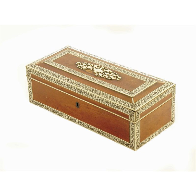 A 19th century Anglo Indian sandalwood glove box, Vizagapatam, with lac decorated ivory banding, the hinged cover with an applied pierced plaque, part missing, 3.5in (9cm) h, 10.25in (26cm) w, 4.5in (11cm) d.