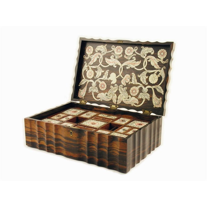 An Anglo Indian coromandel work box, of shaped rectangular form, the hinged cover inset lac decorated ivory of scrolling foliage and birds, to two lift out trays with lidded compartments and conforming decoration and specimen woods, Ceylon, probably late 19th century, 5.75in (14.5cm) h, 16.75in (42.5cm) w, 11in (28cm) d.