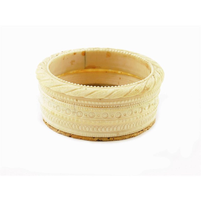 An ornamentally turned ivory coaster, with a turned beech wood base, 2in (5cm) h, 3.5in (9cm) internal diameter.