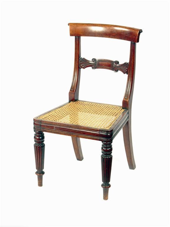 A late Regency rosewood child's side chair, the horizontal splat carved anthemion and bell flower flanking a tablet, to a cane seat on turned ribbed legs, the seat frame stamped 'PP,' 27.25in (69cm) h, 15in (38cm) w.