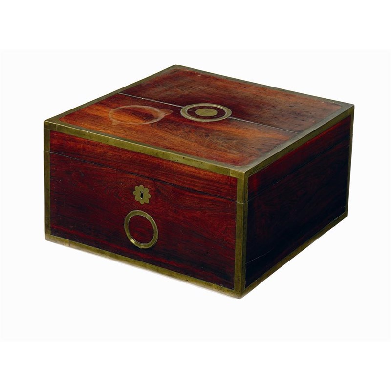 An early 19th century rosewood and brassbound writing box, the top and front with a circular sunken brass handle, the top centred a brass back engraved an S with a ducal crown, the leather lined interior with a lift out tray with remains of partitions, under a plain interior, 8.75in (22cm) h, 14.75in (37.5cm) d. The left side is slightly angled probably to fit under a carriage seat hense the hing handle to the front.