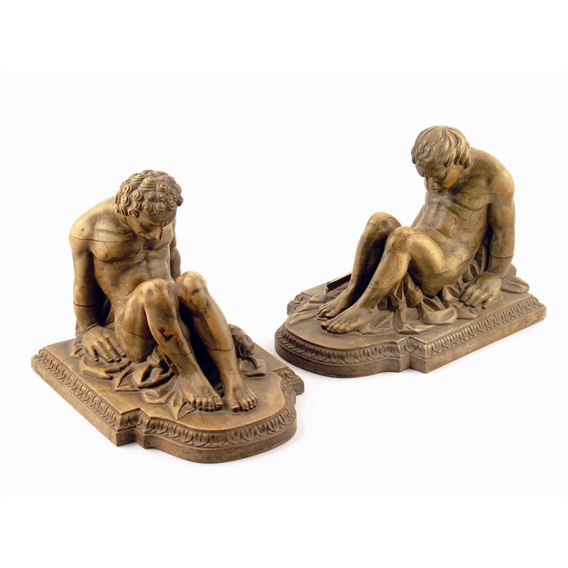 A pair of Austrian carved and stained limewood bookends, modelled as seated nude male figures with bowed heads, one with a club, the other a sword, with inset metal plaques for 'Arch. Hanns Konig, Wien,' 8.5in (21.5cm) h, 10.75in (27cm) l. (2)