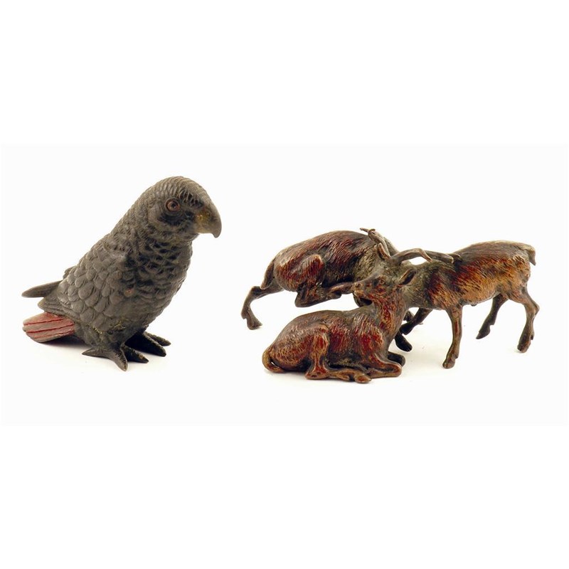 An unusual Austrian cold painted bronze Stag group, with three bodies and one head, 1.5in (3.5cm) h, 3.5in (9cm) w, and a model of a grey parrot. (2)