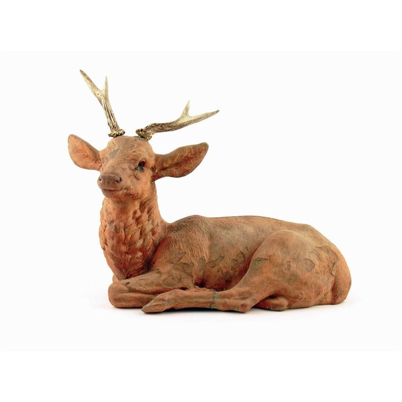 A terracotta model of a recumbent deer, with real antlers, 13.5in (34cm) h, 17.5in (44.5cm) l.