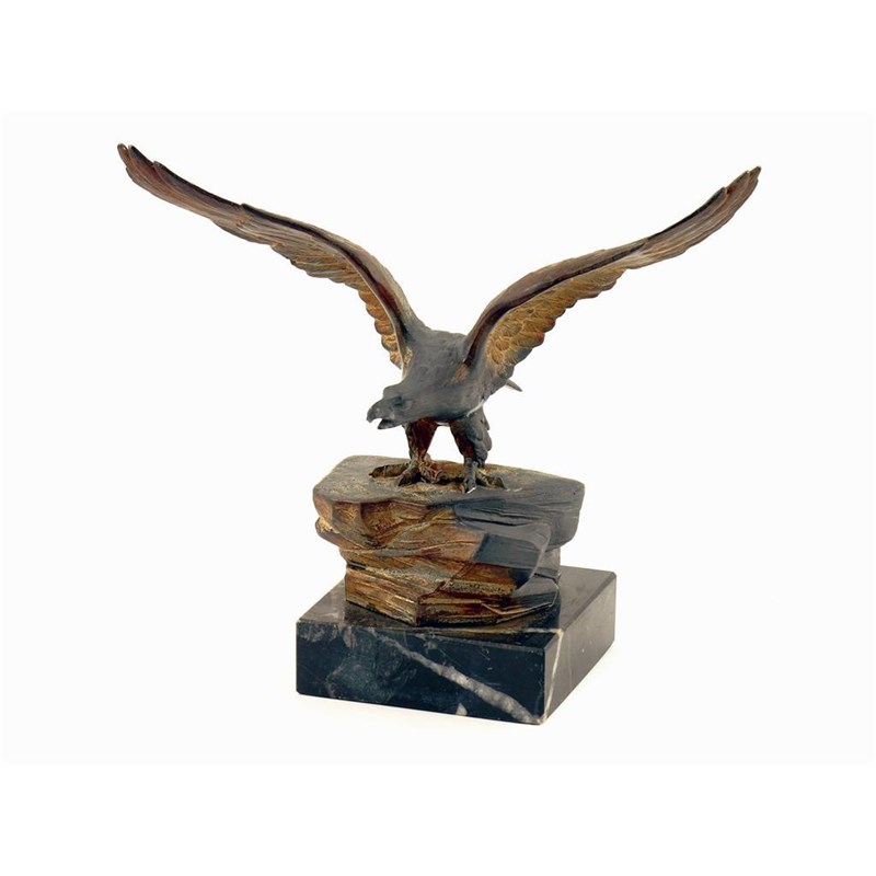 A cold painted lead model of a eagle, on a rocky outcrop and black marble base, 8.25in (21cm) h.